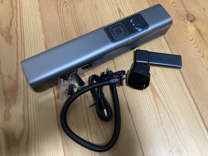掃除ノズルや空気入れノズルが複数付属しており、USBケーブルで充電可能。